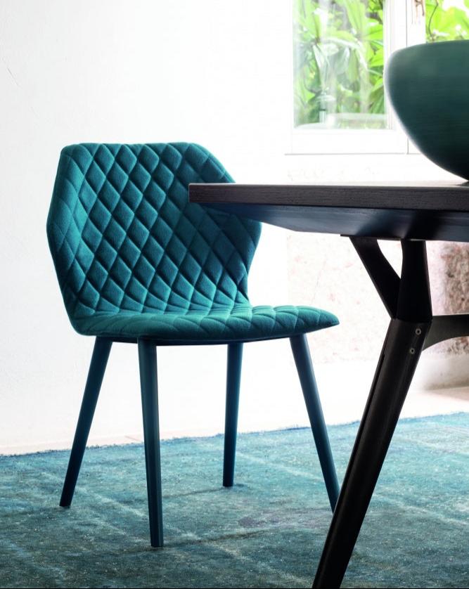 The chair’s structure is supported by sleek metal legs that are cleverly covered in beechwood, offering a natural element to the design. These legs can be customized in natural beechwood, stained, or finished with a matt lacquer to suit different interior styles. The combination of the quilted upholstery and wooden legs creates a perfect balance between softness and structure.